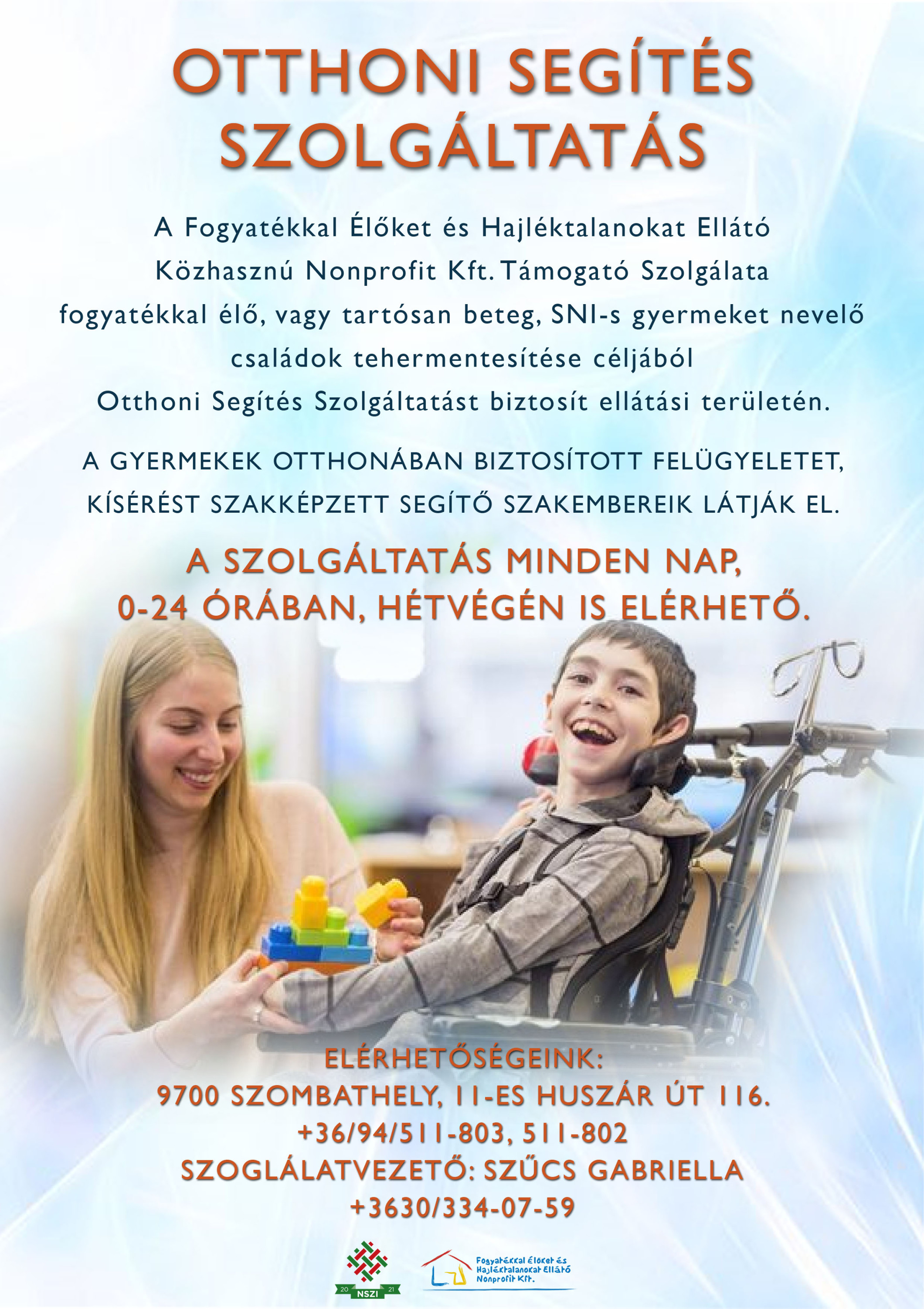 Az otthon segítés szolgáltatás célja elsősorban a fogyatékossággal élő gyermekeket, felnőtteket, sajátos nevelési igényű gyermekeket, tartósan beteg gyermekeket nevelő családok tehermentesítése. Lehetőséget biztosít a családtagok társadalmi integrációjához, a szülők munkaerő piaci visszatérésére, vagy meglévő munkájuk megtartására. A feltöltekezés és kikapcsolódás biztosításával erősíti a család megtartóerejét, így új erőt meríthetnek a családtagok a teherhordozáshoz. Az Otthoni Segítés Szolgáltatás megbízható, felkészült szakmai segítőt küld a családhoz, aki kellő tapasztalattal és tudással rendelkezik fogyatékos személyek gondozása terén és akire a szülők nyugodtan rábízhatják gyermeküket. A szakmai segítő felügyel a fogyatékos személyre, ellátja a személyes szükségleteinek kielégítéséhez szükséges gondozási és alapápolási feladatokat (étkeztetés, tisztálkodás, öltözködés, mozgás-mozgatás, gyógyszerezés), elfoglaltságot biztosít a számára ismerős tevékenységekkel (játék, séta), ha szükséges kíséri az otthona és az ellátó intézmény (iskola, óvoda, napközi) között. A szolgáltatás, rugalmasan alkalmazkodva a családok élethelyzetéhez, a nap 24 órájában, a hét bármelyik napján igényelhető, havonta 15 óra időtartamban. Kik vehetik igénybe?